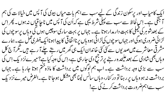 lakin aap is baat se bhe itifaaq kare gai ke hamarai society main berdasht sirf lurki ko kerna perta hai kion ke us ka gher badulta hai doosray loogo ke bech main rehna perta hai lakin lurkay ke lia kuch change nhai hoota same family members hote hai or wo yeh sonch bhee nhai sukta ke khud us ki apni family ke loog jin ki merzy or khooshy se us ki shaadi hoee hai wo khood us ke samne or pechay us ki wife ke sath double behave kare .tu yaha ager lurki berdasht na kare or husband se kuch khenay ki koshish kre tu us ki bewaquffi hoogi kion ke 90% chances hai ke wo choop rahi ga ya belive nahi karega . ya pher luraee ??? tu hum khe sukte hai ke berdasht lurki ko hi kerna hai haa i think waaqt ke sath sath aap adjust kersukte hai apne aap ko ager husband aap ke sath hai or khood bhee understand kerne lagay situations ko.