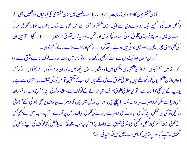 Mera zaati nuqta-e-nazar yeh hai keh hamari duniya wahid duniya nahin kainaat mein aur kainaat jo is qadar waseeh hai jiskey ham siraf aik chhotey sey koney mein hain. Us mein kahee na khaee koi na koi aur duniya zaroor aabad hai. Ab woh ham sey ziyada ilam-o-baseerat rakhtey hain ya ham un sey aagey hain, yeh aik elag sawaal hai. (Mujhey to zaati tor per aaj tak yaqin nahin keh insaan ney chaand per qadam rakha hai keh nahin - i don't belive it).