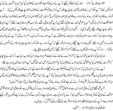 Jab mulk mein opposition itni badi hai jaisa keh MMA ka dawa hai keh woh hain, to sochney wali baat yeh hai keh "aik masjid key imaam ko kya zaroorat pesh aai keh itna bada qadam uthaey?" - Jawab zahir hai yehi hai keh Qazi Hussain Ahmed ho ya koi bhi doosra mazhabi leader jo siyasat sey wabasta hai, inki dorr siraf aur siraf Hakoomat hai - jabkeh Deen ki fiker aik masjid key imaam ko hai!tumharey bas mein agar ho to bhool jao mujheytumhein bhulaney mein shayid mujhey zamana lagey