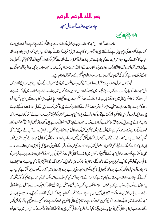 Khurram main Laal Masjid key barey mein to kuchh nahin janta magar siraf Musharraf per comment karoon ga keh Pakistan ko yarghumal aik fard-e-wahid ney nahin bnaa rakha - balkey aik taweel system ney bnaa rakha hai jo keh currupt hai! Musharraf to aik kath'putli hai - jiski jaggah per koi bhi hota to aisa hi karta! Yeh baat uski bilkul drust hai keh Pakistan ko qaid chand hazar khandano ney bnaa rakha hai - aur wohi is system ko chala rahey hain jiska Musharraf 'bawa' hai (jantey hain miti ka bawa).