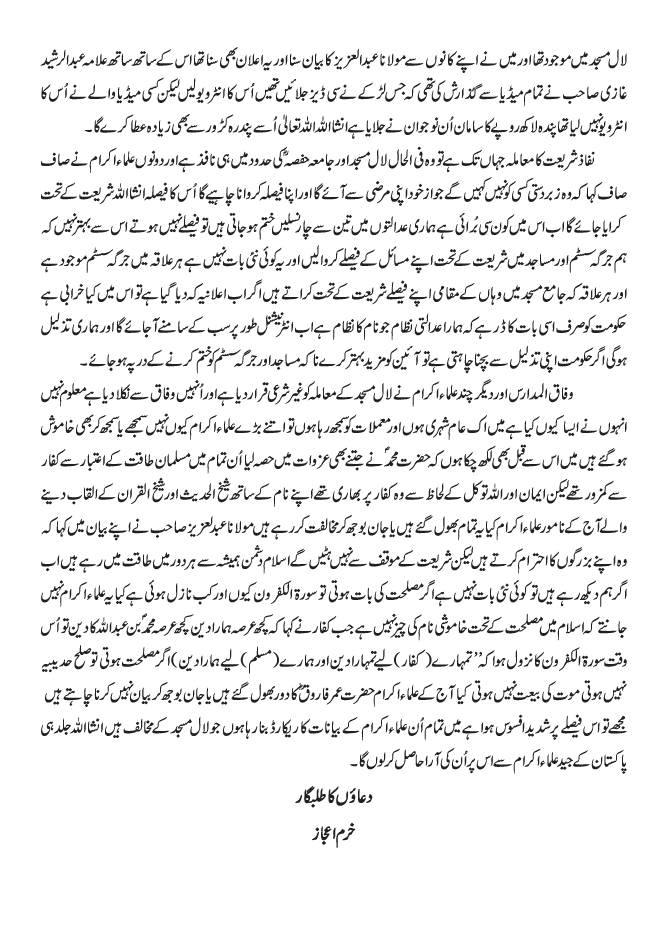 Jab mulk mein opposition itni badi hai jaisa keh MMA ka dawa hai keh woh hain, to sochney wali baat yeh hai keh "aik masjid key imaam ko kya zaroorat pesh aai keh itna bada qadam uthaey?" - Jawab zahir hai yehi hai keh Qazi Hussain Ahmed ho ya koi bhi doosra mazhabi leader jo siyasat sey wabasta hai, inki dorr siraf aur siraf Hakoomat hai - jabkeh Deen ki fiker aik masjid key imaam ko hai!