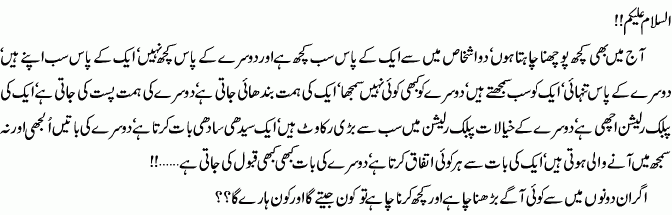 Originally posted by ScorpioN_RulzZ:cc:, agar daikha jaiy to theek .... aur aap nay bilkul theek kaha kay aksariyat isi cheez ko manti hai.. laikin me here sis kia jeetnay ka haq osay nahee jis kay pass kuch nahee, person A to pehlay he jeeta howa hai :(