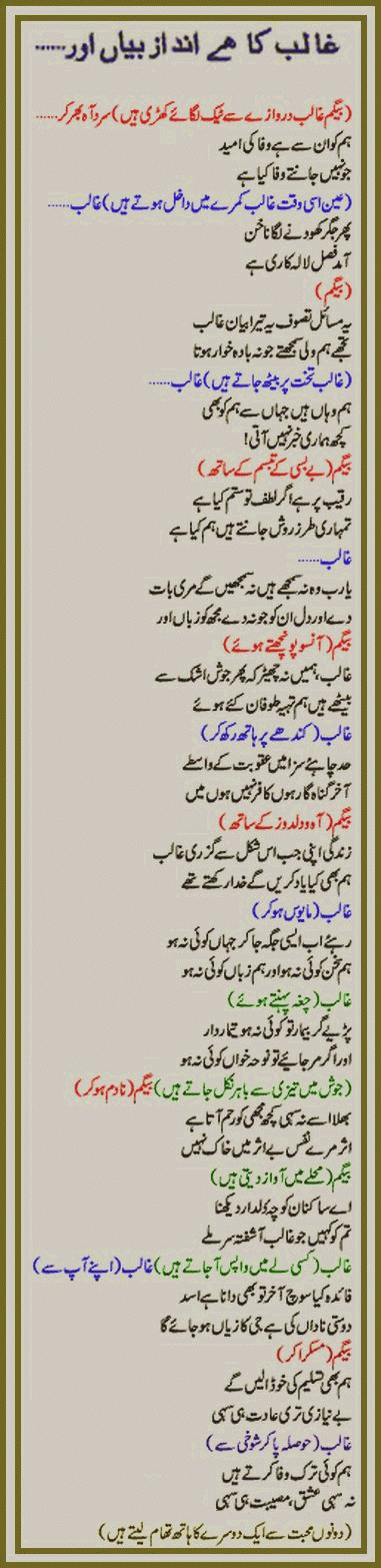 halankey ghaalib ki bivi tho pehley he sey ghaalib sey bohot baizaar thih aaj woh apni shaariry ghaalib key andaazibayan main dekhh ker hairaan bhi hai aur pareshaan bhi,aur kaashif saab key intizaar mey bhi hai,