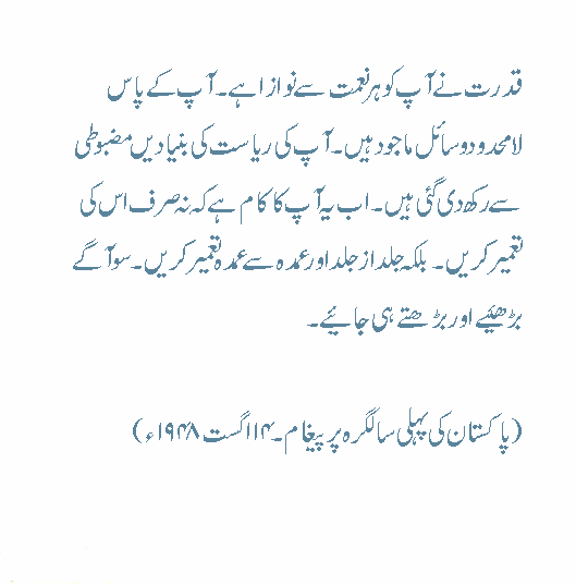 "Pakistan not only means freedom and independence but the Muslim Ideology which has to be preserved, which has come to us as a precious gift and treasure and which, we hope other will share with us."