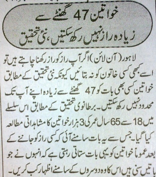 Aur haqeeqat mey bhi yahi sab hota hai, hamari society mey aik aurat bohot hi insecure samjhi jati hai, halankey ye saari insecurities uss ko muashrey k mardon ki taraf sey milti hain, phir ab science daan bhi beychari khawateen k peechey perh gaye hein :-D aaj ye theory aai hai kal koi aur aa jani hai. // Sigh!" Obstacles are what you see when you take your eyes off your goals "