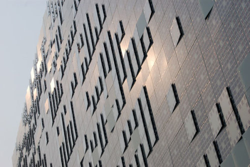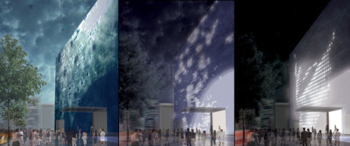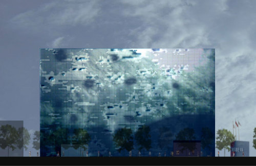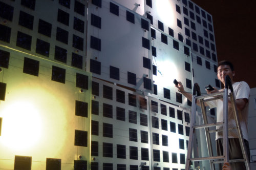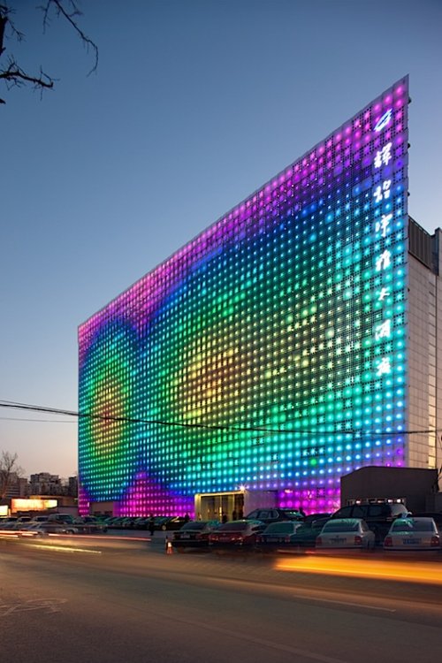 It mixes the largest color LED display technology with a photovoltaic system which means that the wall burns the only energy it harvests during the day.