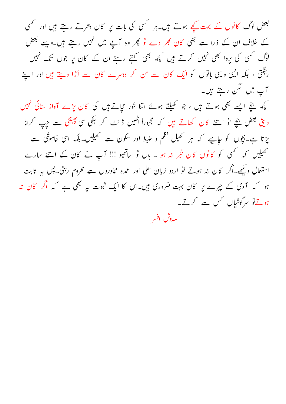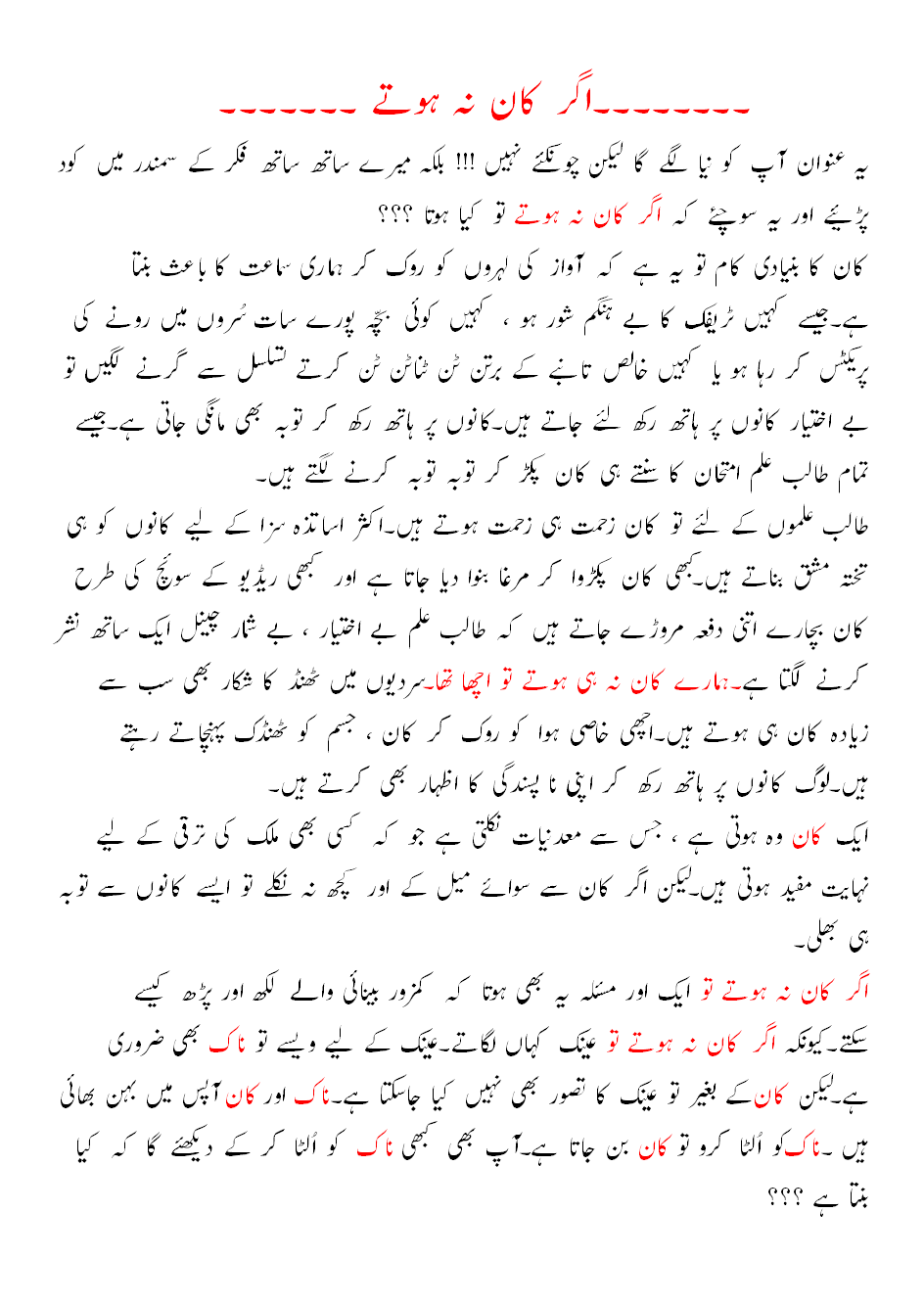 Kaan jaisi naimat ALLAH SWT humain ata karkay humain khushnaseebi ata ki hay aur humain iss baat ki sab say baRi khushi hay kay jab aik musalmaan kay haan bacha paida hota hay tou sab say pehlay uss kay kaan main AZAAN dee jaati hay aur ussay iss nounayhaali main hi samjha dia jaata hay kay tu Ummat-e-Mohammadia SAW main paida hua aur teray liye kamyaabi srif uss ki raah per chalnay main hay...... na kay tu inn kanoon ko kisi ki gheebat sunnay main lagayay, loud music sunnay main istimaal karay yaa phir un buri baatoon ko sunnay jo inn kaan kay rastay teray dil-O-dimaagh per naqsh band hojayain aur tou uss pehli azaan ko bhool jayay jisay baRi aqeedat-O-ahteraam say teray kisi baRay, yaa buzurg nay teray kanoon main paRhi...