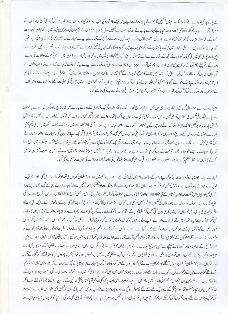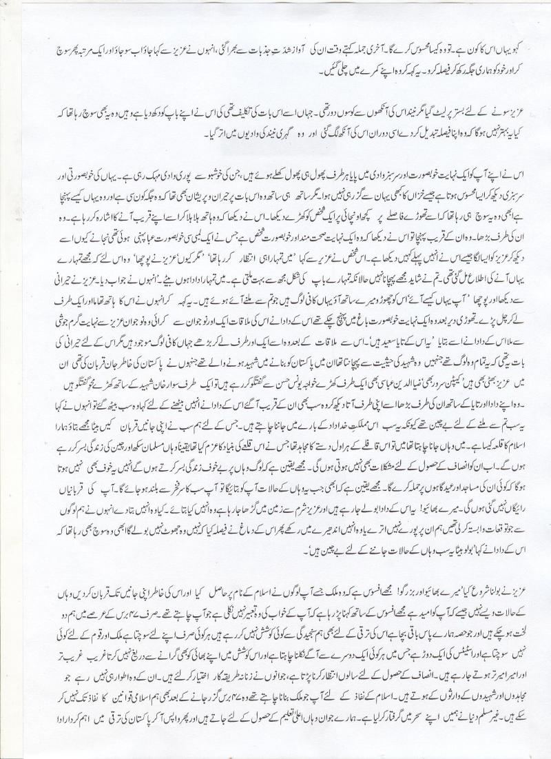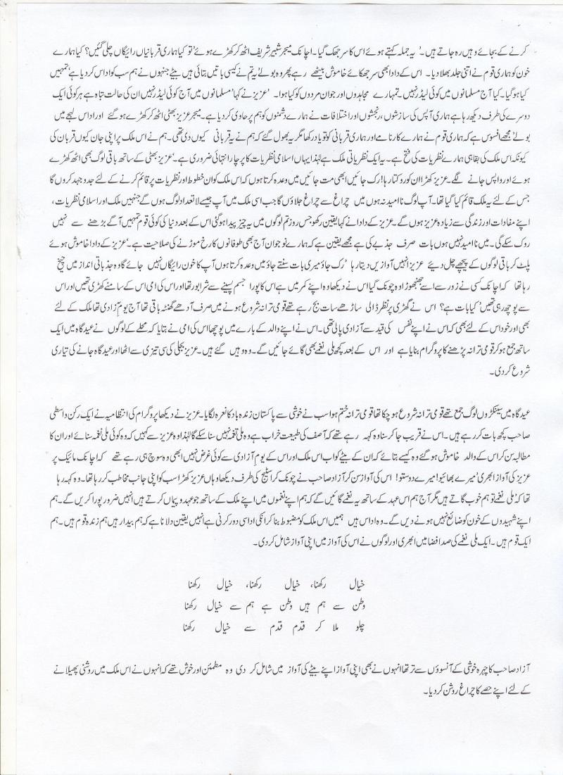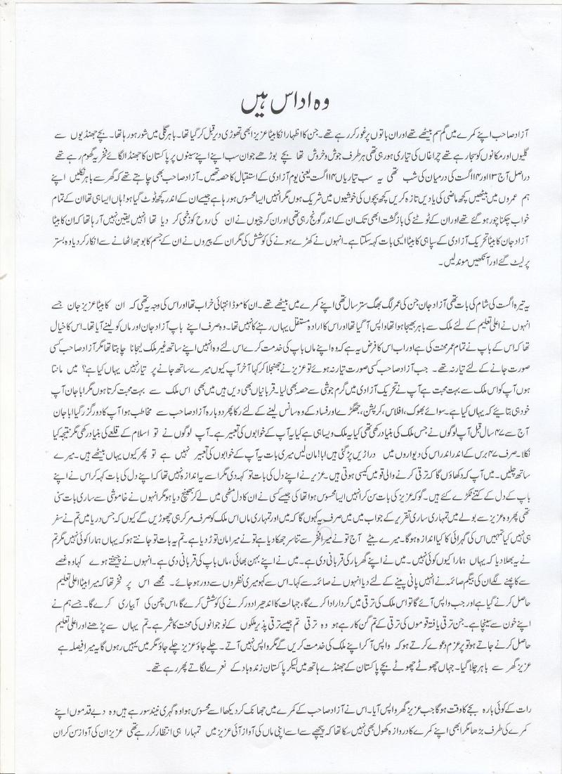 Main kia kahoon, aap nay apni tehreer main sab kuch tou keh dia, yaqeen karain iss waqt ankhain purnam hain aur meray paas aap ki tehreer ki tareef kay liye alfaaz hi nahin..... main apnay aap ko aik chota sa bad-tar sa insaan mehsoos kar raha hoon, waqayi humaray aba-o-ajdaad nay iss mulk ko haasil karnay kay liye apni jaan kay nazraanay tak paish kar diye aur hum hain kay unki qurbaaniyon ko bhool kar srif aur srif apnay mafaadaat kay baaray main sochtay hain.