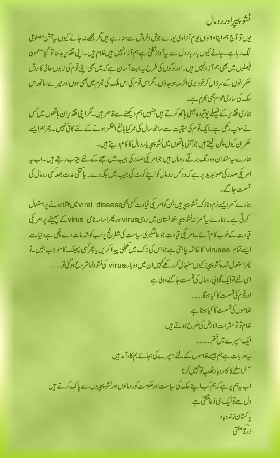 Aaj duniya mein jitni bhi so-called aazadi ki jangein, ya war against terrorism larri jaa rahi hain, yeh dar'haqeeqat asleh ki jangein hain jo khatam nahi hongi. Duniya mein agar koi aman ka sab sey bada dushman hai to woh multi-multi national companies hain jo aslah bnati hain! Khud america majboor hai in companies key samney aur duniya per jangein musalat kar deta hai, aur naam rakh deta hai: war against terrorism!