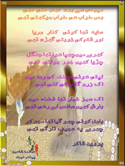 Is martaba Competition ke liyeh jo gazal muntakhib ki gayi hai wo Perveen Shakir hai. Aap sab pls apni entries 31st Dec se pehley submit ker dain, is martaba dorania mukhtasir hai jis ki waja yeh hai ke Jan 2006 se designed shairi ke sab competition re-organize kiyeh jayein gai. Is liyeh yeh Competition Jan' 06 se pehley khatam kerne hain :) .