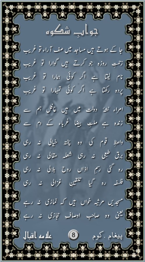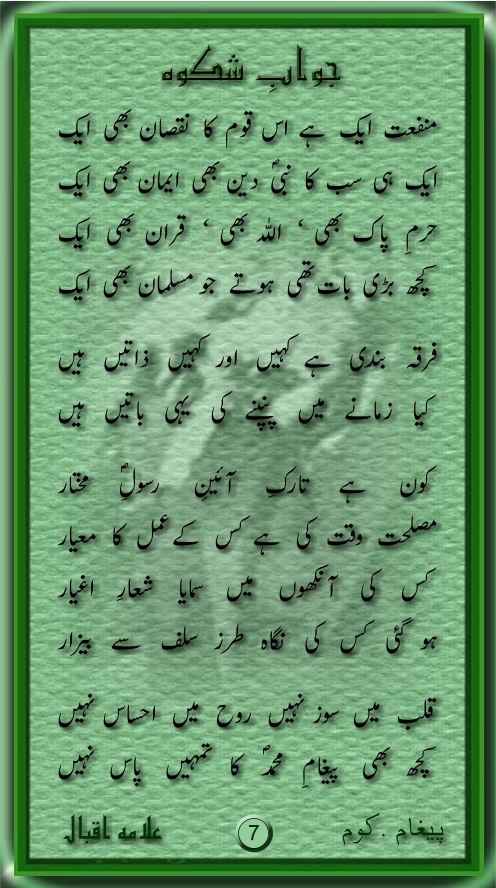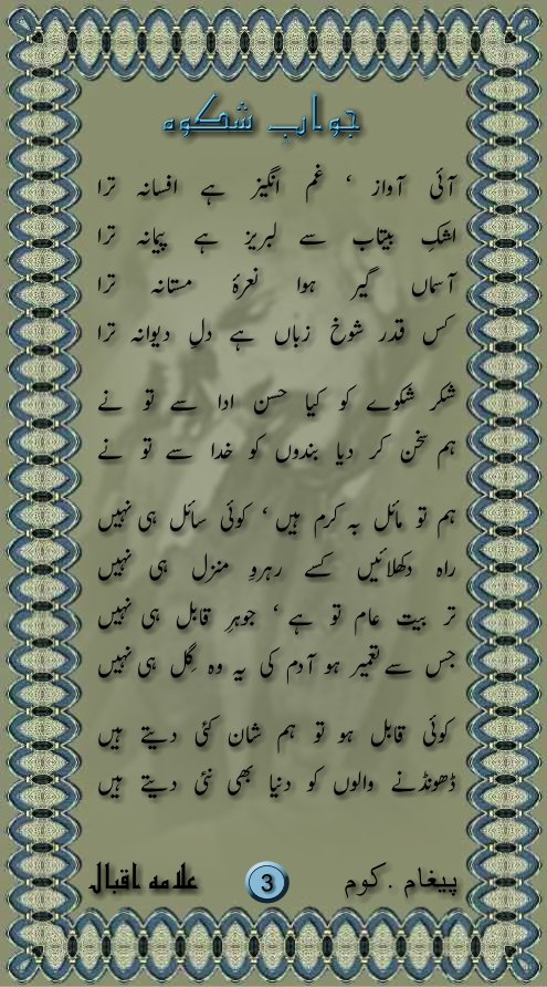 Allama Iqbal ka shikwa aur jawab-e-shikwa ney mujhey bohat kuchh seekhaya hai aur mujhey jab likhney ka shoq pedah huwa to inhi nazmon ko parh ker huwa, yeh woh batein hain jo ham musalmano ko har dor mein tarpati hain... lekin afsos ko is per gehraii ki soch nahin rakhta....