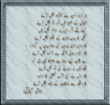 Shuker hai aap ko kuch tu pasand ayaOriginally posted by jugnoo217very beautiful................mein bhi yehi poem design karne ka soch raha tha leken image nahi mill raha tha..........aur aap number le gaieen, itni achhi sharing ka bahut shukrya.............khush rehye