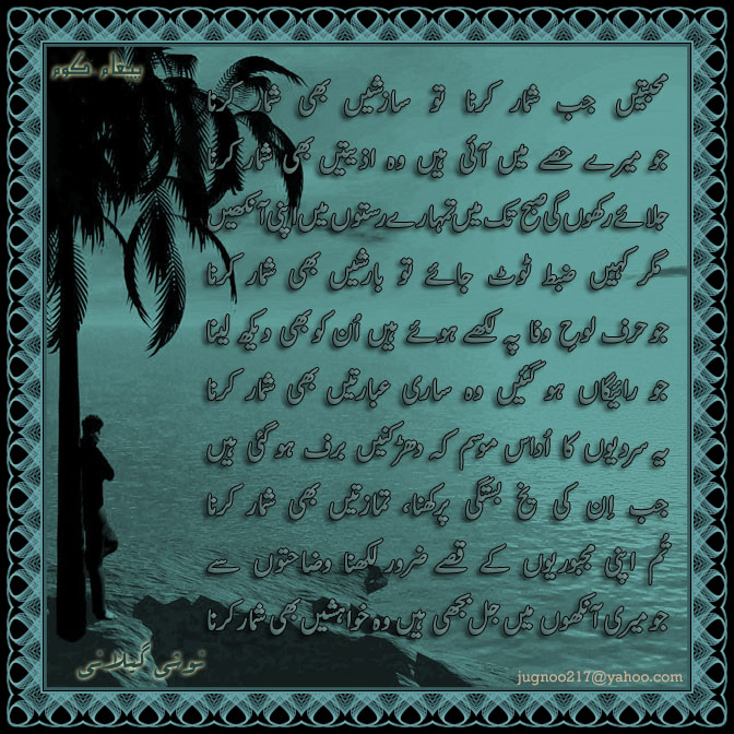 shukrya wafa ji............Originally posted by Wafadono images achi hai lekin 2 wale ziada pasand aaye........nazm bhi bohot achi hai ......very nice .......:thmbup: :)Dheeray Dheeray Machal Aye Dill-e-Beqarar