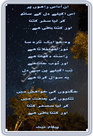 duaa kaa mamnoon hoon ,,,,,,,,,,,,,,,,,sadda hanstii muskuraatii raheyey:roseOriginally posted by Saima ShaheenOhh.. Khuda aap ko sehat dai, Ameen :duaQaffas-e-hijr mein