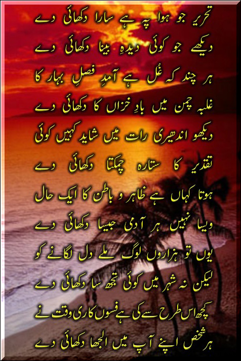 Wah ! shakeel bhot umda ... aap say aik request hay me ko ya pata nahi chalta hay kay ya aap kay apnay kalaam hay ya kisi aur kay agr mumkin ho to naam bhi likh diya karay ...