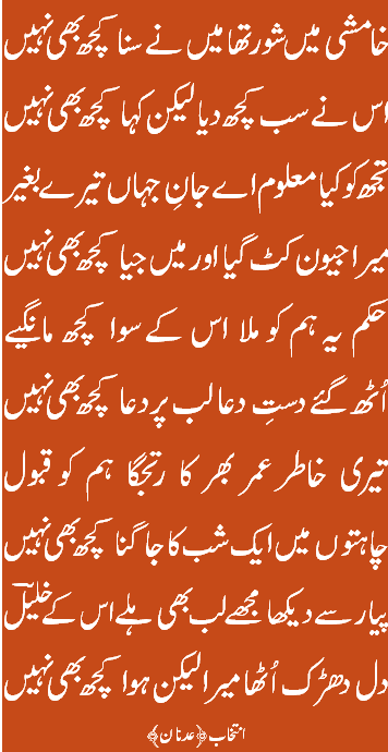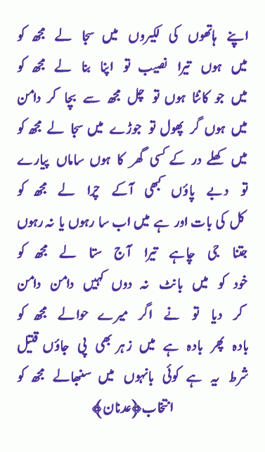 Adnan bohat zabardast bohat pasand aaya aap ka intikhaab - agar aap shaair ka naam bhi likh detey to bohata achha hota. But keep it up. Is saada andaaz mein bohat rawani sey kahi huwi pyari si ghazal share karney peh shukriyah :rose