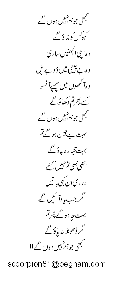 @ I said, over all ur poetry selectionz r nice ... specially the last Nazam... that I liked so much (chalo nazam lekhti hia.. ) :thmbup: