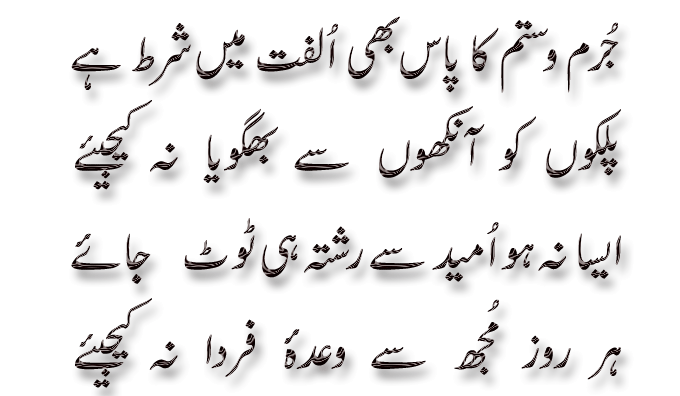 bethey hain ham tahayya-e-toofaan kiyey huweytumharey bas mein agar ho to bhool jao mujheytumhein bhulaney mein shayid mujhey zamana lagey