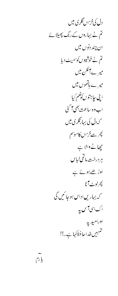 Aik ehsaas jo ham sab jantey hain. Kabhi kisi ko pardes jatey huwey Khuda Hafiz kehtey hain to kabhi apni muhabbat ko bichhertey dekh ker Khuda Hafiz kehtey hain.