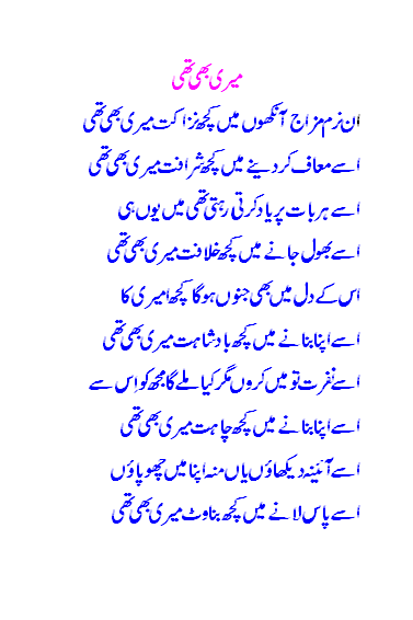 ap ki ye gazal waqye bahot achi hae sirf kuch lin oper niche kar dain to bahot achi ho jaye gi jayse akhri ki lin ko darmiyan main hona chye tha kion ke jo ap khena chati hain who mix ho gaya hae main koi nakad nahi hon magar jo meri samjh main aya who main ne likh diya hae