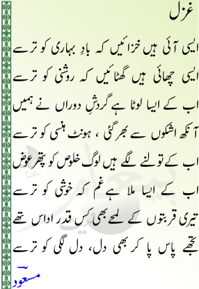 Masood humesha ki trah aap ne boht achi trah se apnay khyalat ko lafzon ki soorat di hey, shukriya, Allah karay zor e qalam aur zayada ho aur aap apni shayeri ko humaray sath bant'tay rahein.