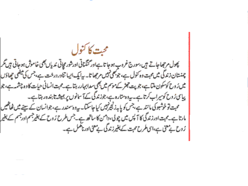 Thats very nice,,,,,,ap ney bohat acha likhka hai.muhabat k baghair kuch bhi nahi hai....1 main bhi arz karta hoon muhabat k nam..