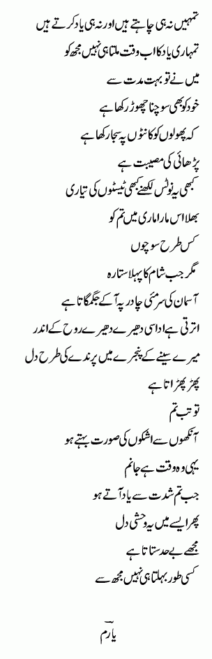 Yaaram :) Tum ko kis tarah sochoN ...:) aik bari payari nazm pesha hai yeh meri nazm mujhey bohat pasand hai :) meri best takhleeq :)