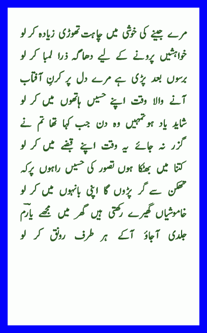 Aap bouhat achay shaair hai'n.jo bhi likhtay hai'n kamaal likhtay hai'n.aap ka likha huwa har kalaam bouhat pur asar hay jo read kar k acha laga.Masha Allah:)