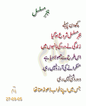 Yaaram ji ''Hijr-e-Musalsal'' parh kay andaaza huwa kay aap kitnay umda poet bhi hai'n. ab mai'n aahista aahista aap sab ka likha read bhi karu'n gi ta'kay mai'n bhi aap logo'n say kuch seekh saku'n.Nazm bouhat pasand aai hay.:)
