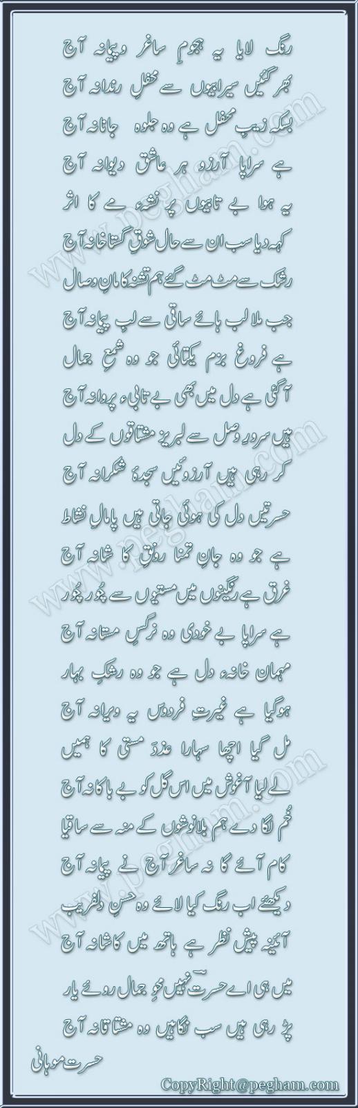 • Ranglaya hai yeh hajom saghar-o-pemana ajj.