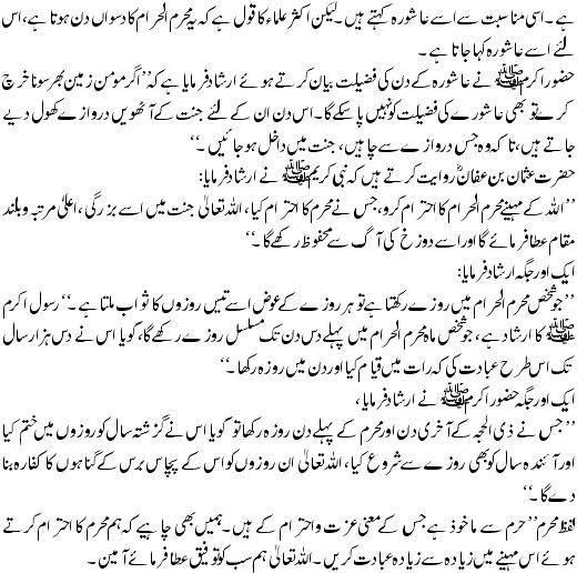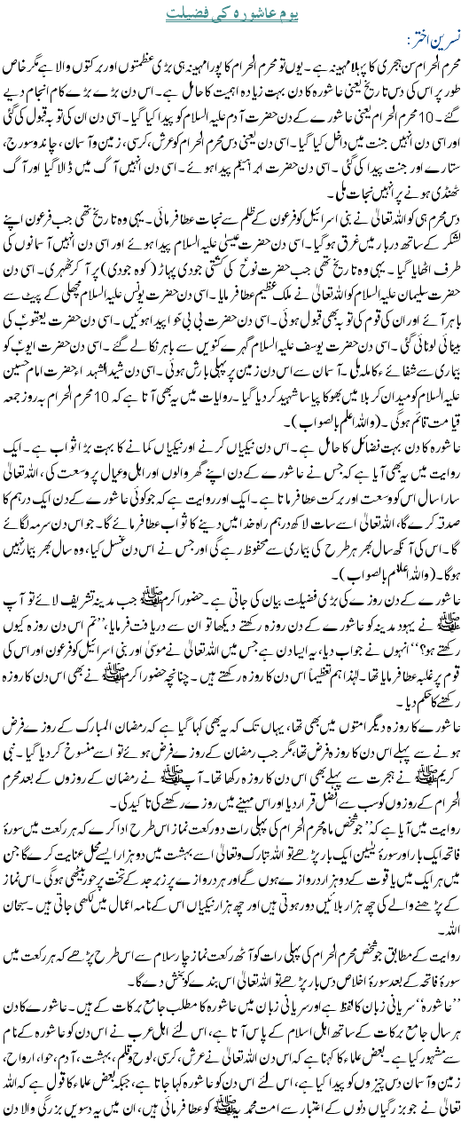 ASHOORAY ka din bohat hi ahmiyat ka haamil hay aur humain iss din ziyada sa ziyada ibaadat main guzaarna chayeh aur issi taleem ko pooray saal apnaana chayeh, sabr, aur qurbani ka yeh pegham aaj ummat-e-Mohammadia SAW ko Hazrat Imam Hussain aur aal-e-Rasool SAW ki shaadat say mila hay woh hum sab kay liye aik mishal-e-raah hona chayeh aur humain unki qurabaniyon ko khiraj-e-aqeedat paish kar kay aik acha aur sacha musalmaan bann kar poori duniya ko amn, sabar aur qurbaani ka sabaq daina chayeh.